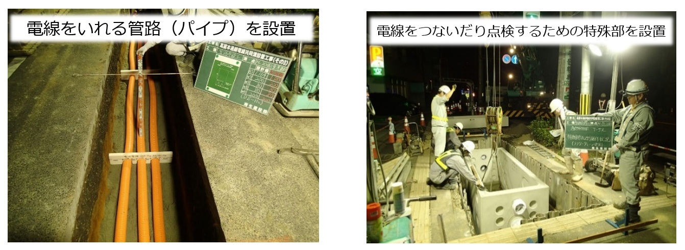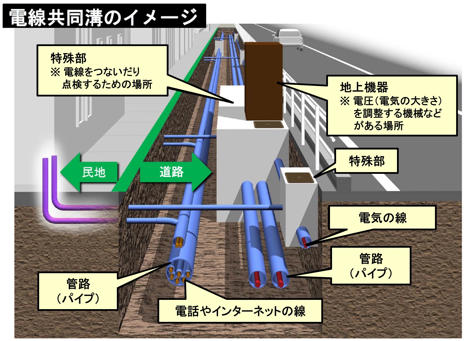 無電柱化を進めるにあたっては、道路の下に、電線などを通すための電線共同溝(でんせんきょうどうこう)と呼ばれる管路等を設置しています。