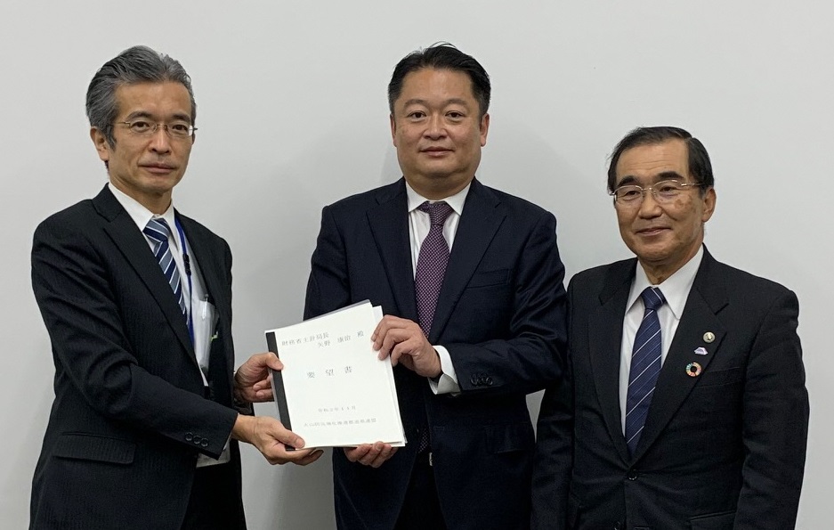 令和2年11月12日、火山防災強化推進都道県連盟(幹事:山梨県長崎知事(写真中央))とともに、財務省矢野主計局長(写真左)に対して要望を実施しました。