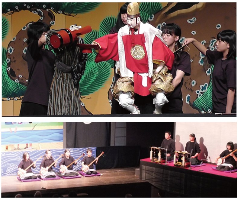 南淡中学校は、兵庫県南あわじ市にあり郷土芸能部は昭和五十八年の開校と同時に創設されました。人形遣いは、淡路人形座の吉田史興師匠に、語りと三味線は、鶴澤友吉師匠に指導を受けています。三味線は、師匠の熱心な指導のおかげで生徒自身の手で弾けるようになり、人形・語り・三味線の全てを生徒たちで上演できるようになっています。