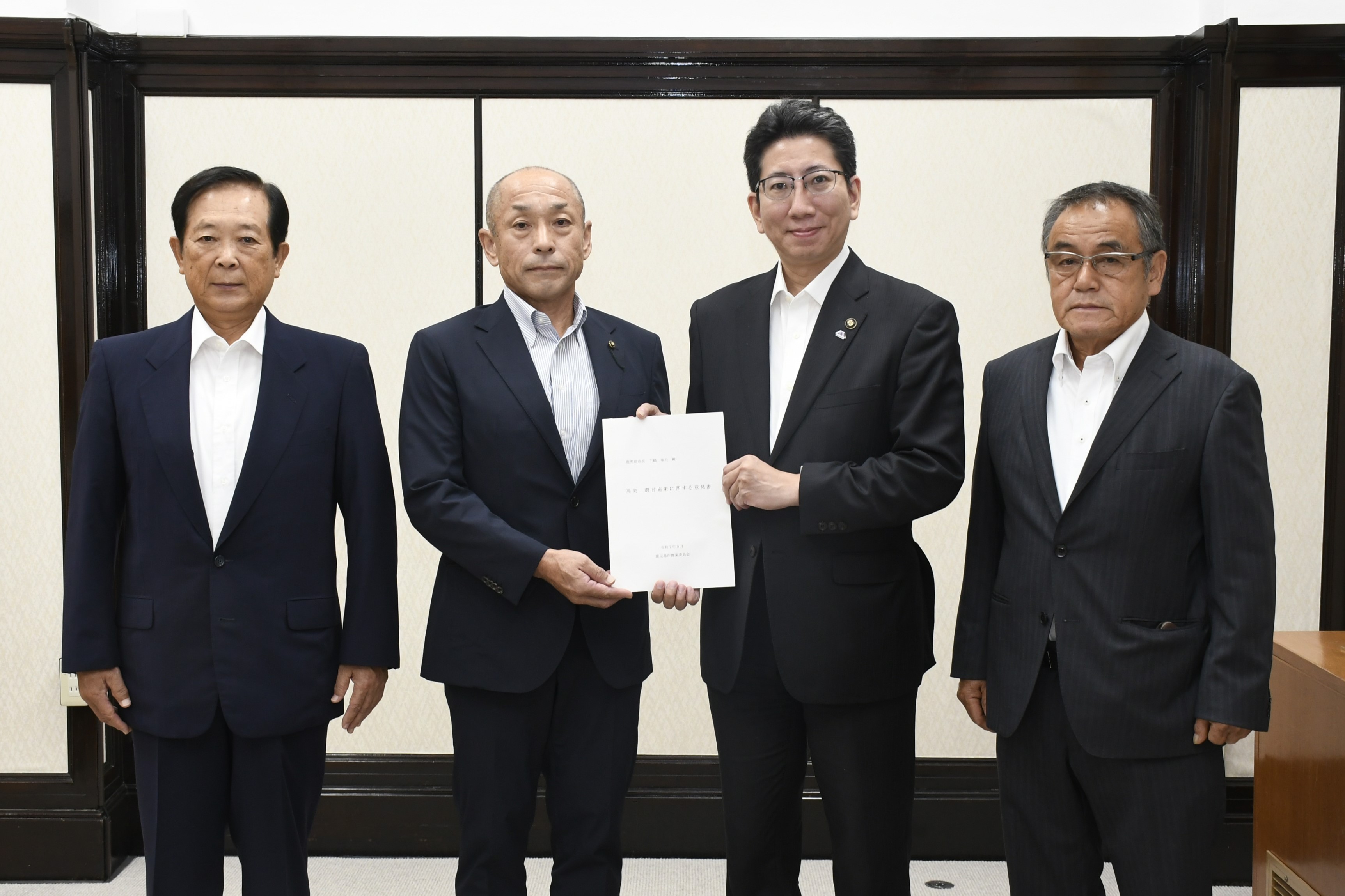 左から鳩宿運営委員、仮屋会長、下鶴市長、永尾会長代理