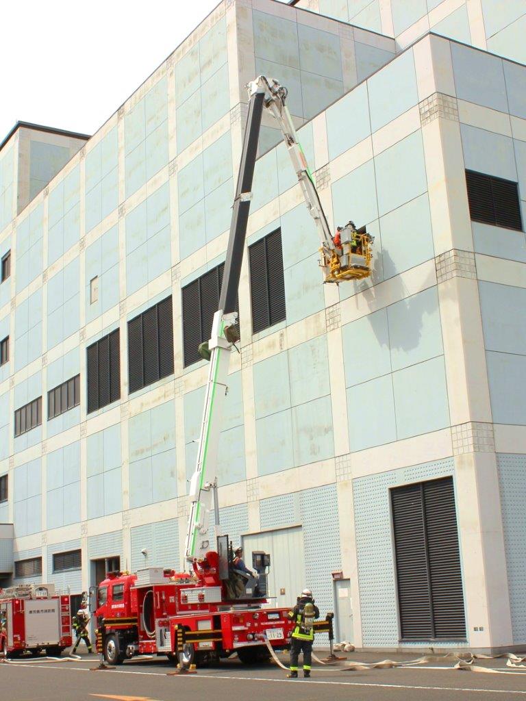 屈折可能なはしごを伸梯し、中高層建物火災等で消火及び救助活動を行う車両です。