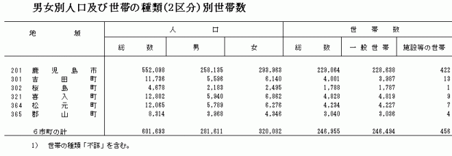 平12国調:男女別人口及び世帯の種類(2区分)別世帯数 |